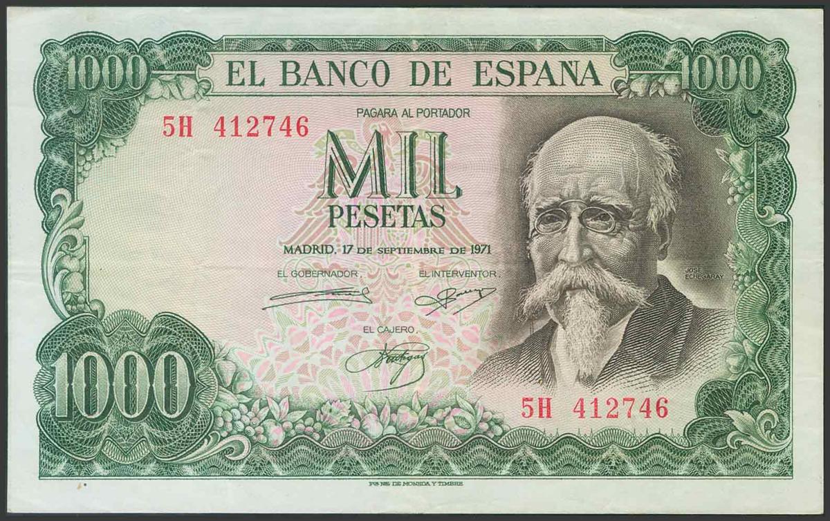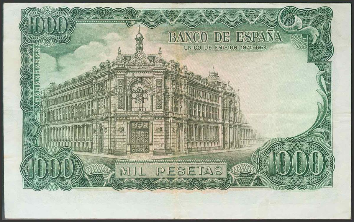 1000 Pesetas. 17 de Septiembre de 1971. Error de impresión, el reverso desplazado hacia arriba. Serie 5H. (Edifil 2017: 474c). Inusual y muy espectacular. MBC.