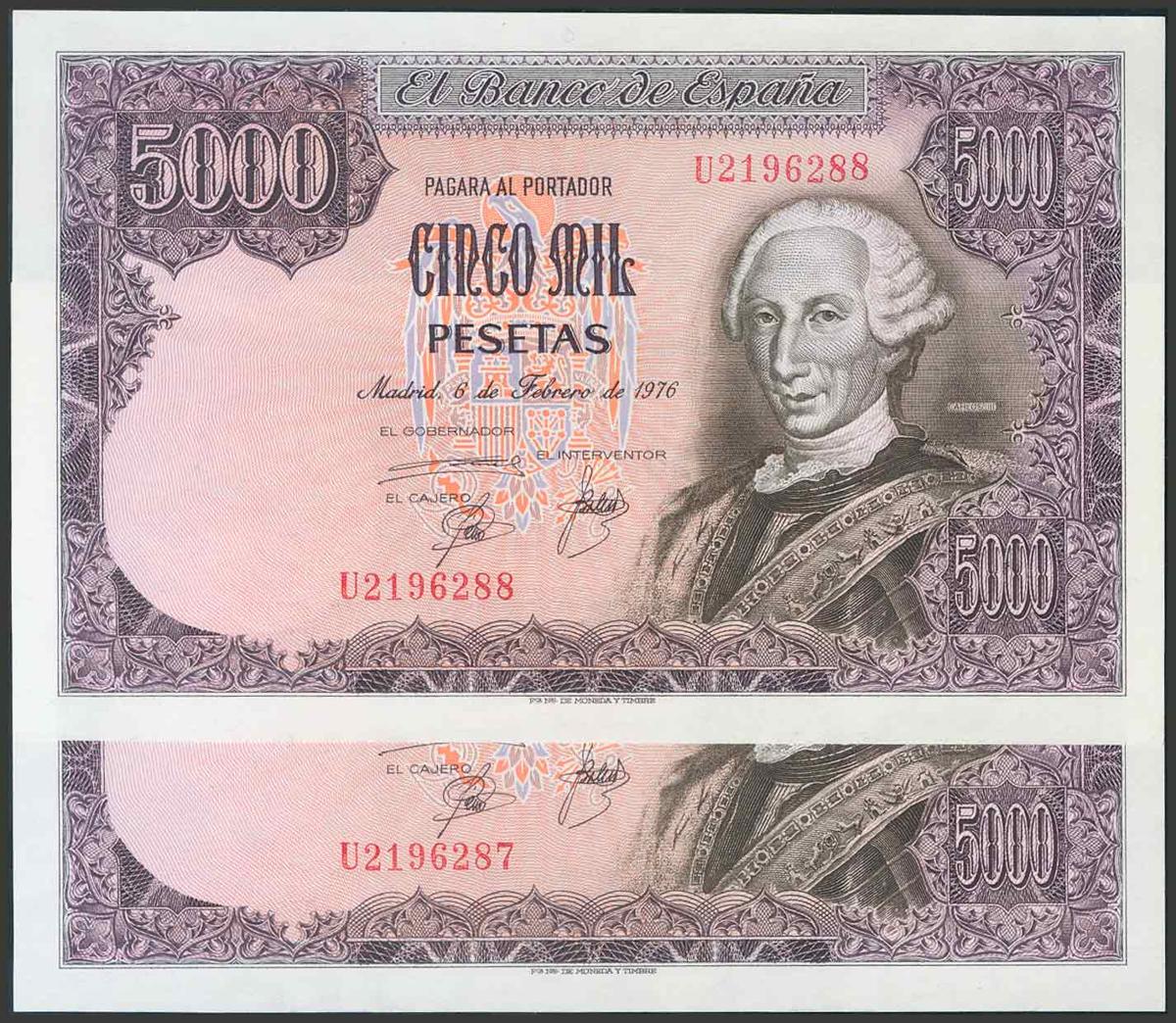 5000 Pesetas. 6 de Febrero de 1976. Pareja correlativa. Serie U. (Edifil 2017: 475a). Apresto original. SC/SC-.