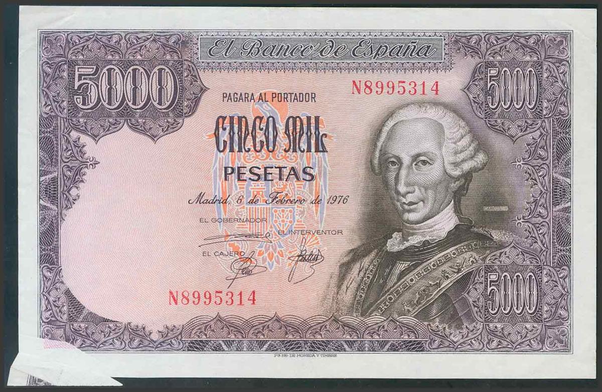 5000 Pesetas. 6 de Febrero de 1976. Error de guillotinado en la esquina inferior la izquierda. Serie N. (Edifil 2017: 475a). Inusual y espectacular. EBC.