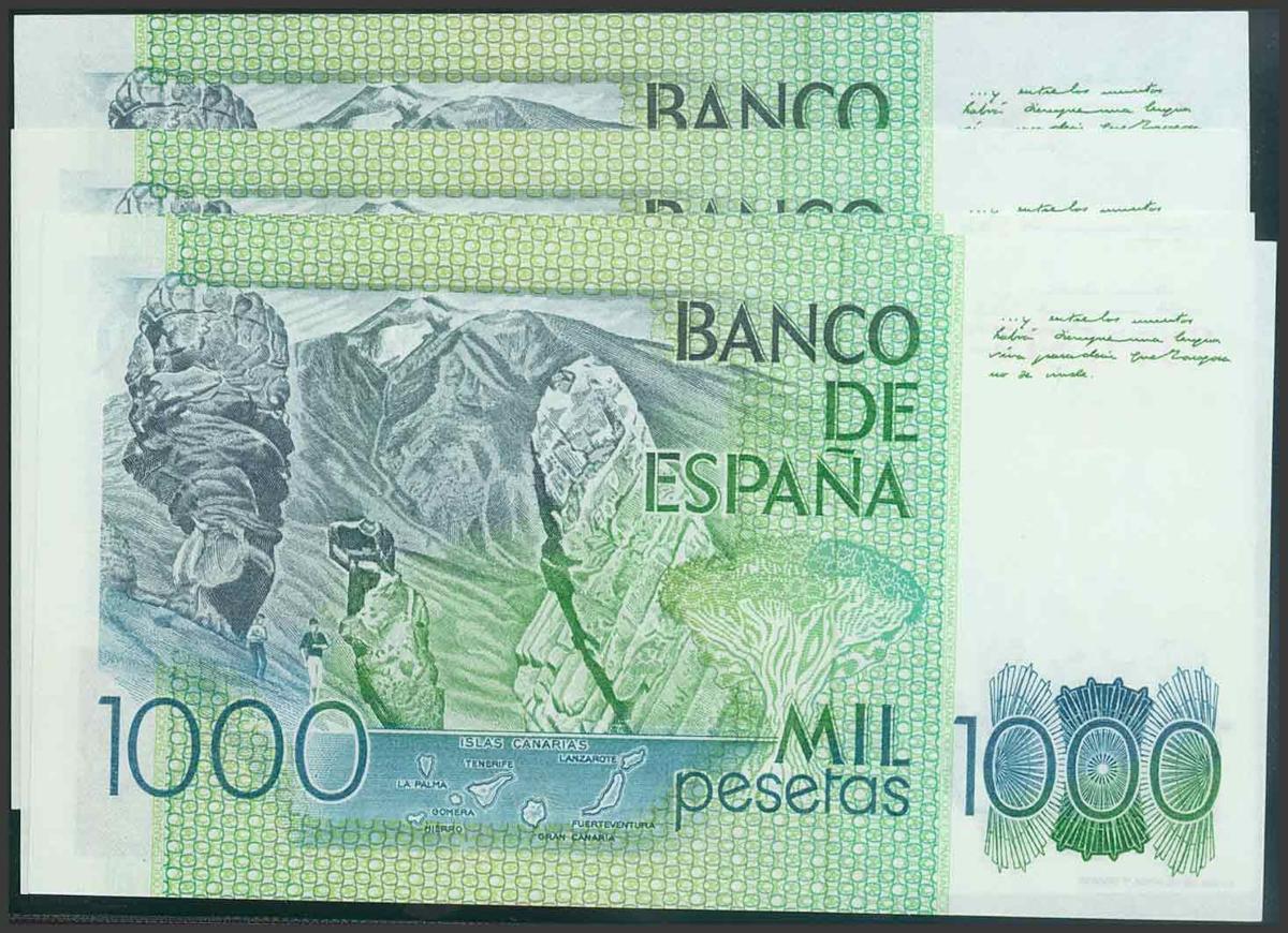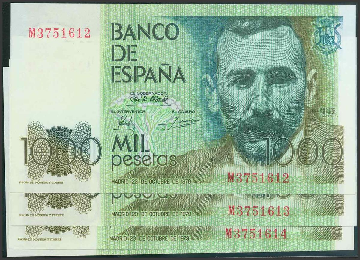 Conjunto de 4 billetes correlativos de 1000 Pesetas emitidos el 23 de Diciembre de 1979, serie M (Edifil 2017: 477a). SC.