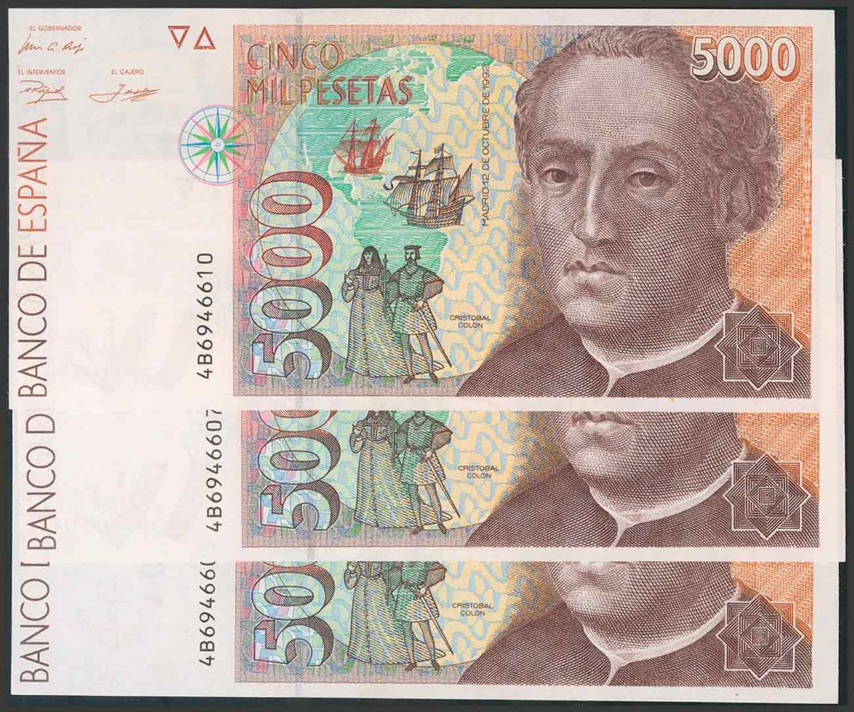 Conjunto de 3 billetes no correlativos de 5000 Pesetas emitidos el 12 de Diciembre de 1992, serie 4B (Edifil 2017: 484a). SC.