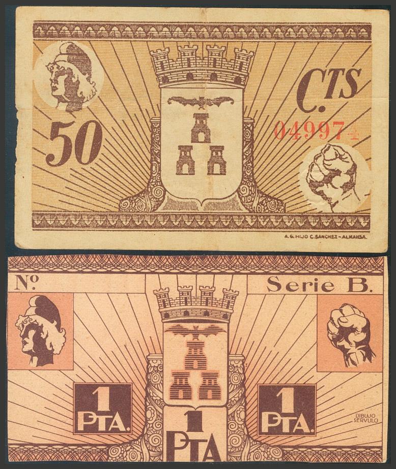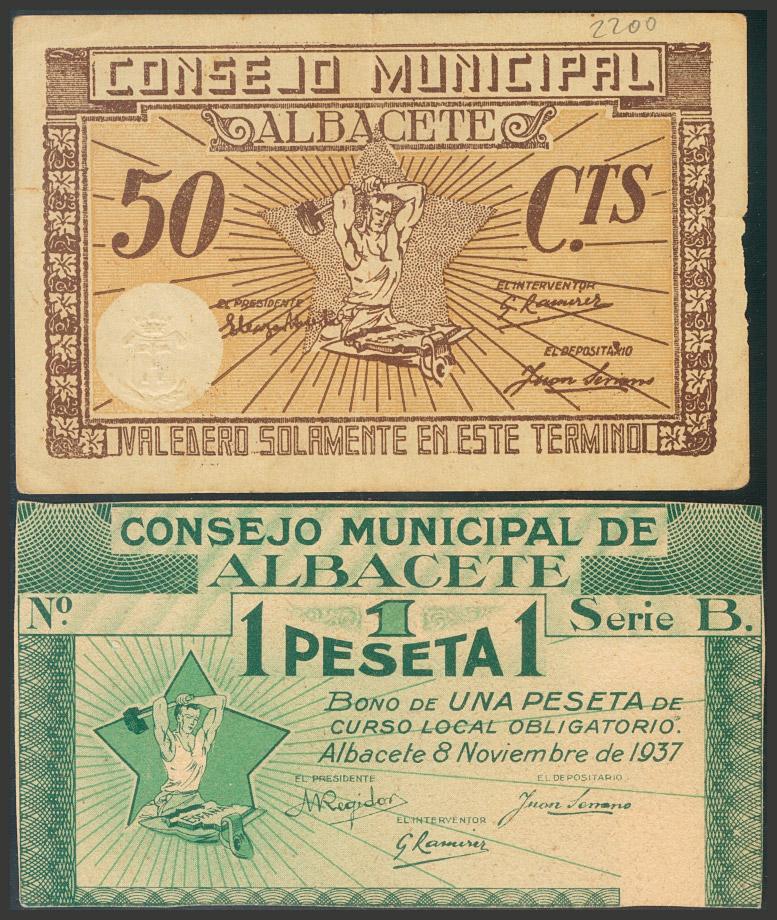 ALBACETE. 50 Céntimos (1ª Emisión) y 1 Peseta (2ª Emisión). (1937ca). (González: 128, 132). BC+.