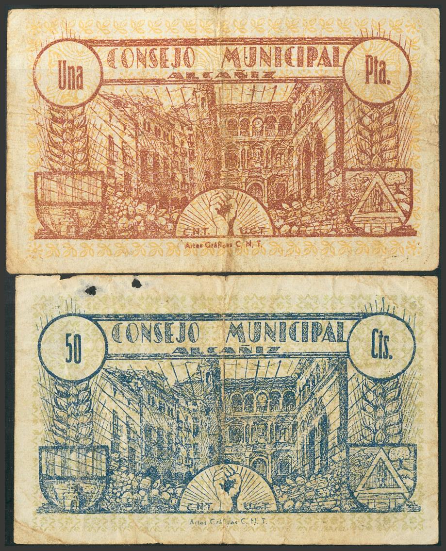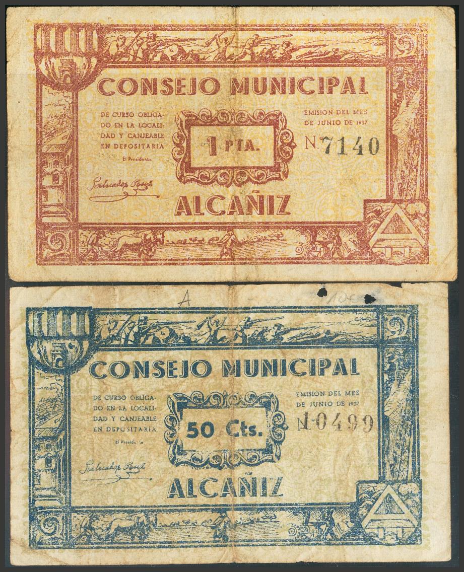 ALCAÑIZ (TERUEL). 50 Céntimos y 1 Peseta. Junio de 1937. 1ª Serie. (González: 297, 298). BC.
