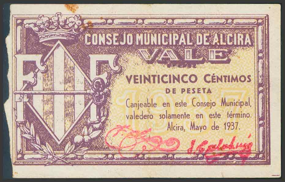 ALCIRA (VALENCIA). 25 Céntimos. Junio de 1937. (González: 324). RC.