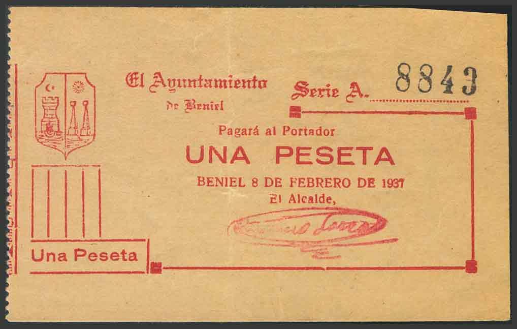 BENIEL (MURCIA). 1 Peseta. 8 de Febrero de 1937. Serie A. (González: 1098). EBC.