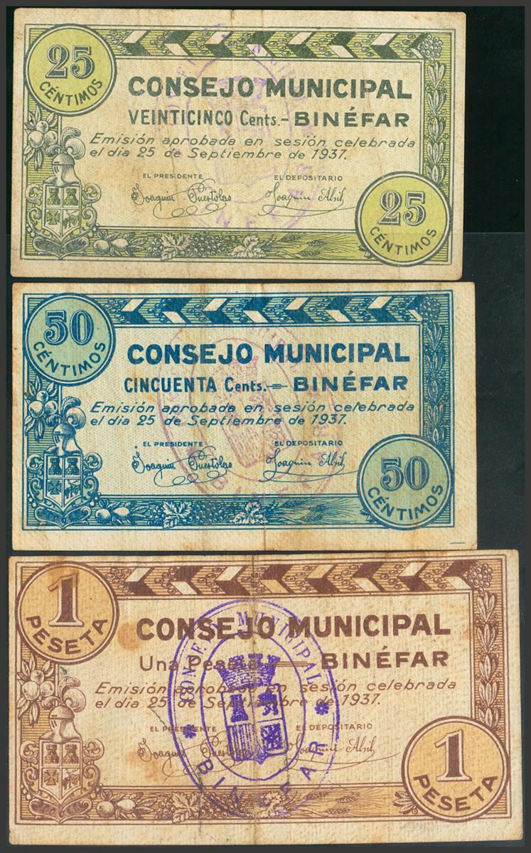 BINEFAR (HUESCA). 25 Céntimos, 50 Céntimos y 1 Peseta. 25 de Septiembre de 1937. (González: 1228, 1229, 1230). BC.