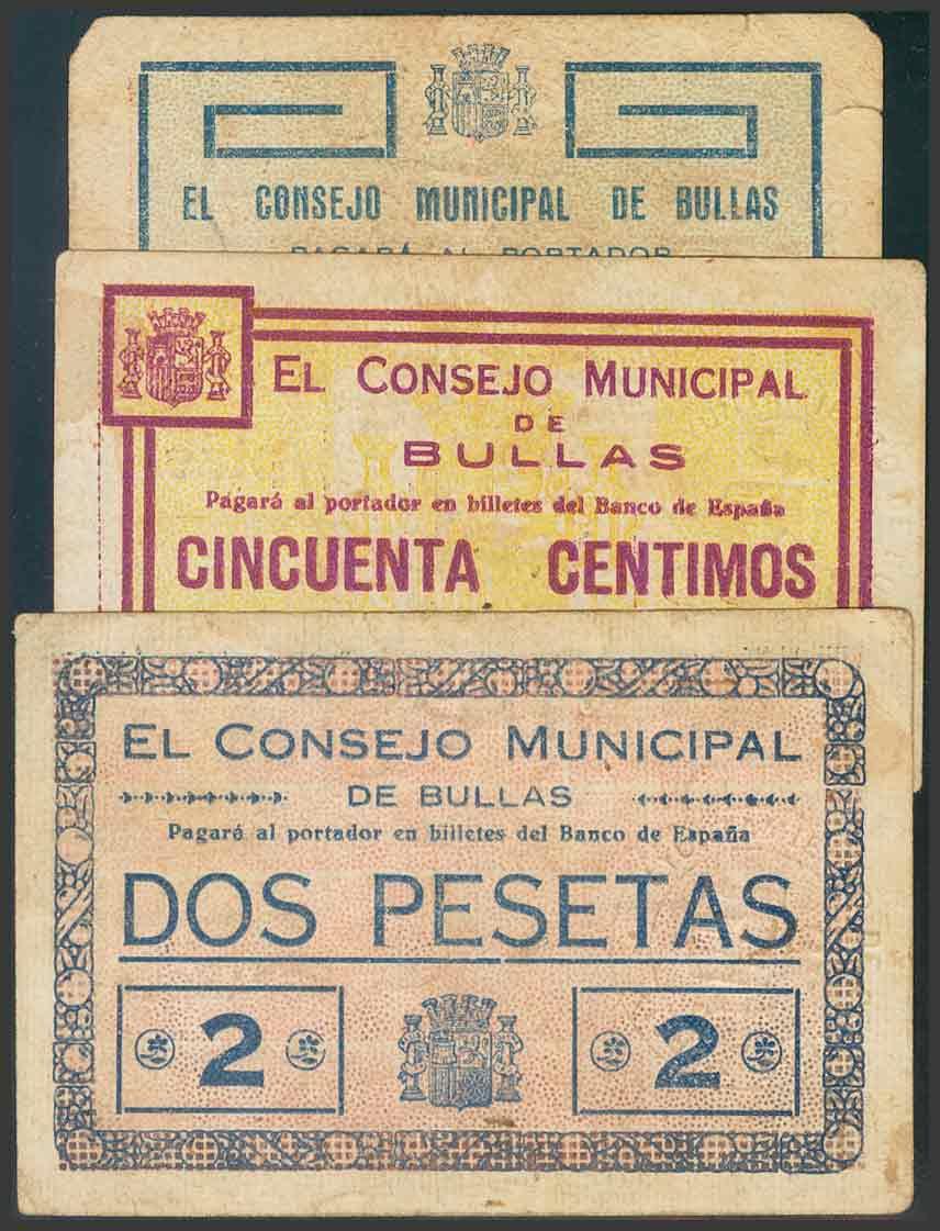 BULLAS (MURCIA). 25 Céntimos serie B, 50 Céntimos serie A y 2 Pesetas serie B. (1938ca). (González: 1317/18, y el 2 pts no catalogado aunque está mencionado en el catalogo). BC.