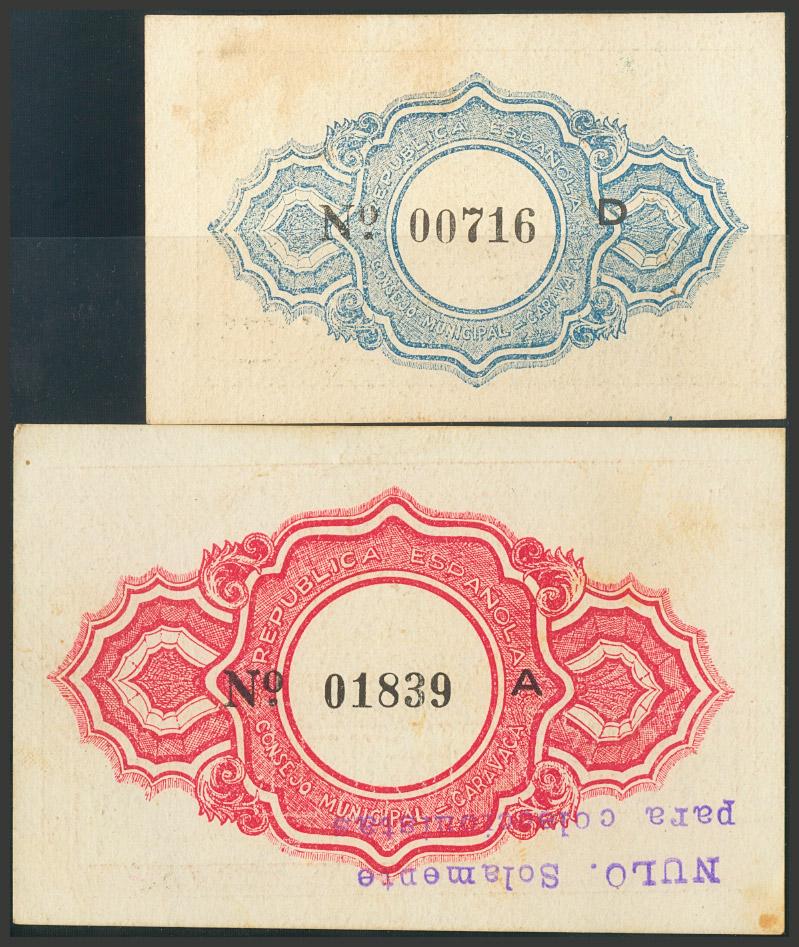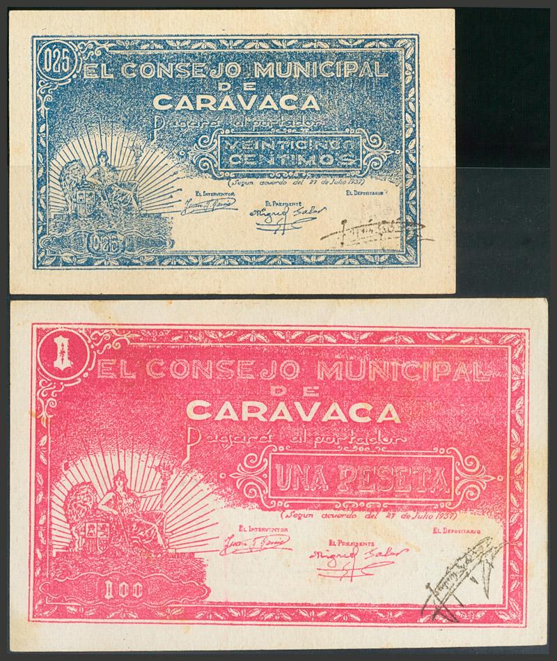CARAVACA (MURCIA). 25 Céntimos, serie D y 1 Peseta, serie A y con inscripción mecanografiada "Nulo: Solamente para coleccionistas". 27 de Julio de 1937. Sin serie. (González: 1609/10). MBC.