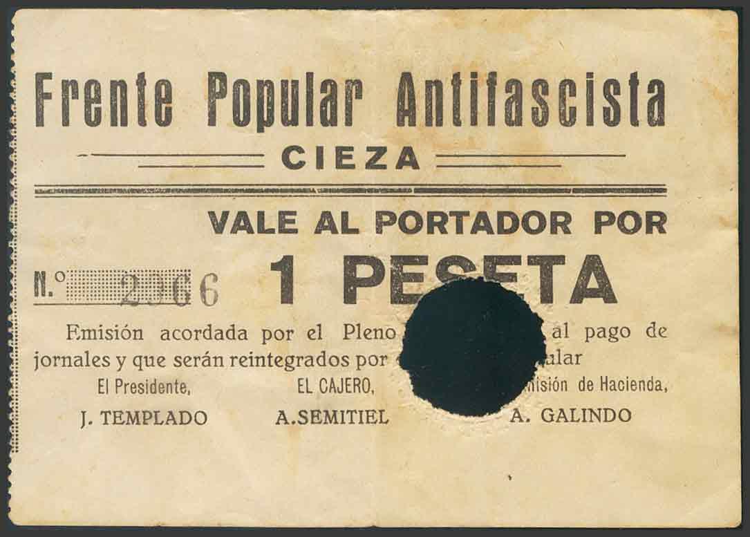 CIEZA (MURCIA). 1 Peseta, con taladrado. (1938ca). Emitido por el Frente Popular Antifascista. (González: 1967). MBC.