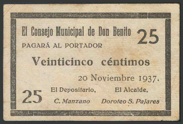 DON BENITO (BADAJOZ). 25 Céntimos. 20 de Noviembre de 1937. (González: 2238). BC.
