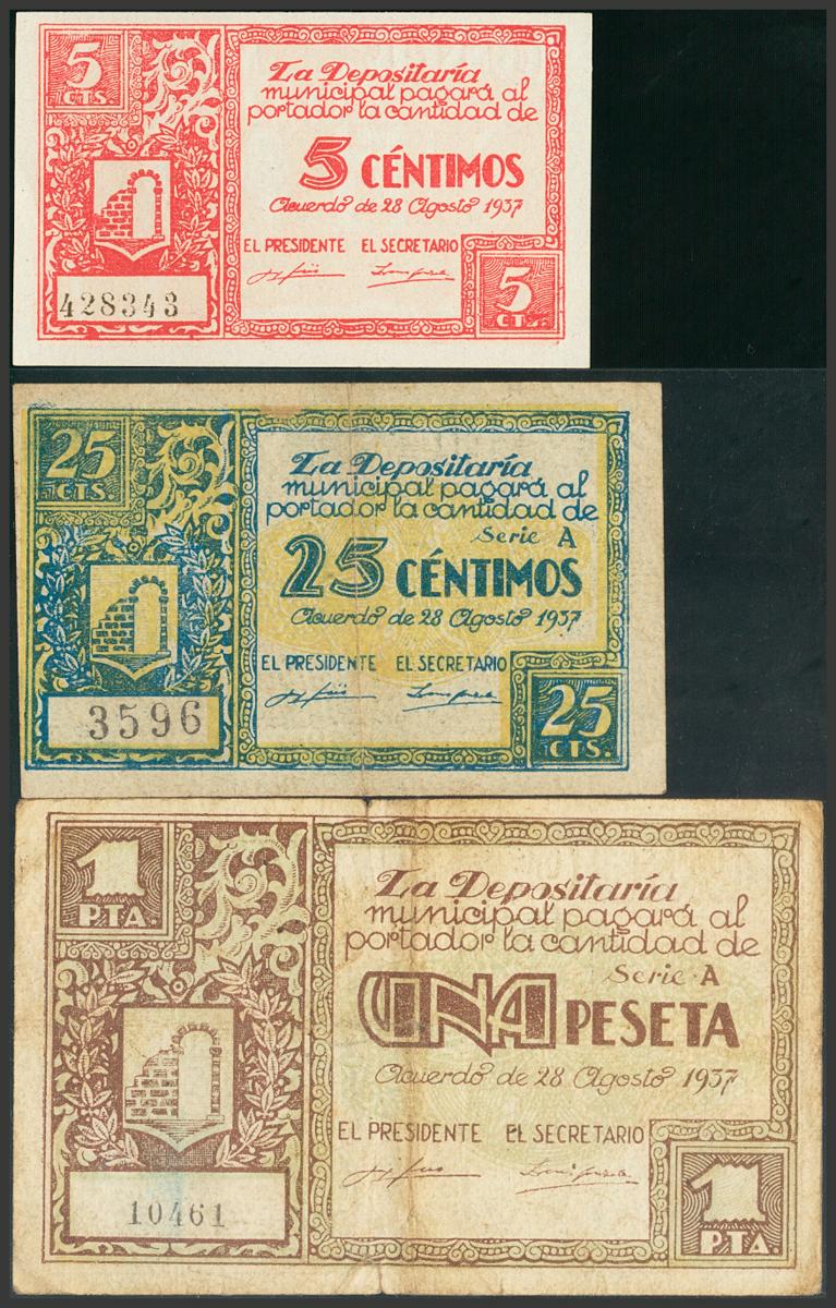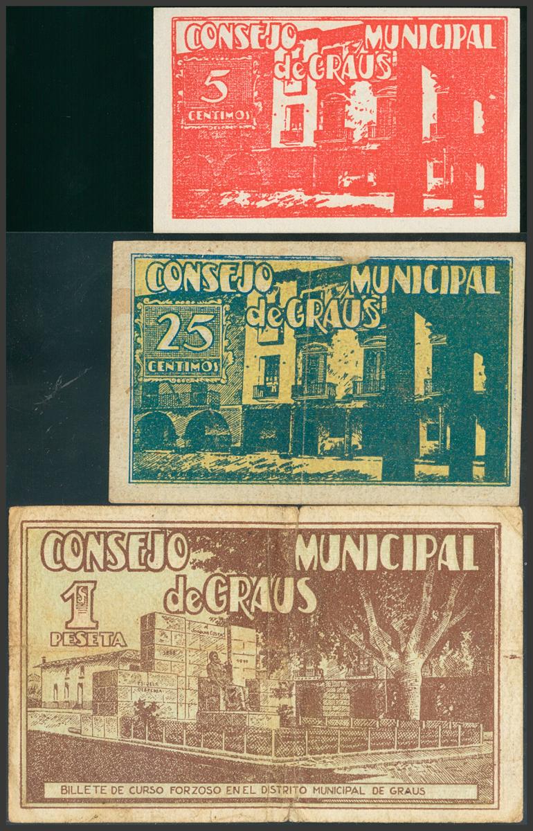 GRAUS (HUESCA). 5 Céntimos, 25 Céntimos y 1 Peseta. 28 de Agosto de 1937. (González: 2726, 2727, 2729). BC.
