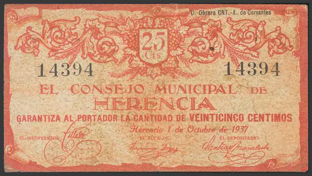 HERENCIA (CIUDAD REAL). 25 Céntimos. Octubre de 1937. (González: 2818). Inusual. BC.