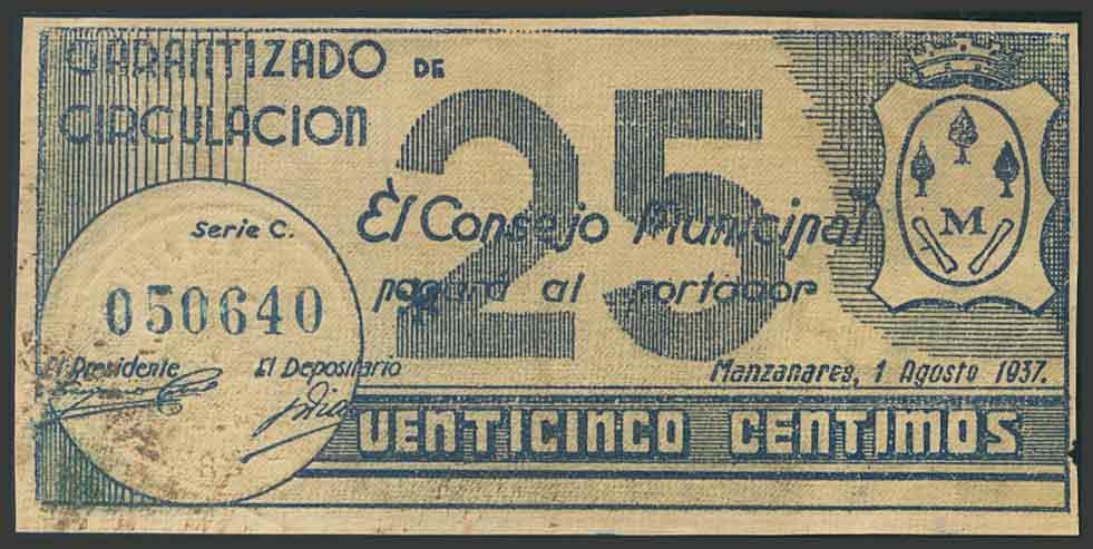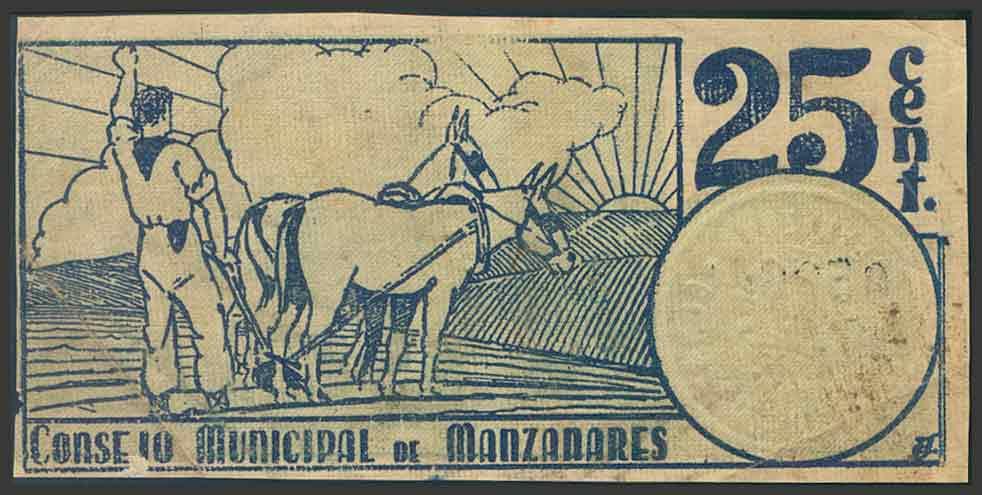 MANZANARES (CIUDAD REAL). 25 Céntimos. 1 de Abril de 1937. (González: 3369). Inusual. BC+.