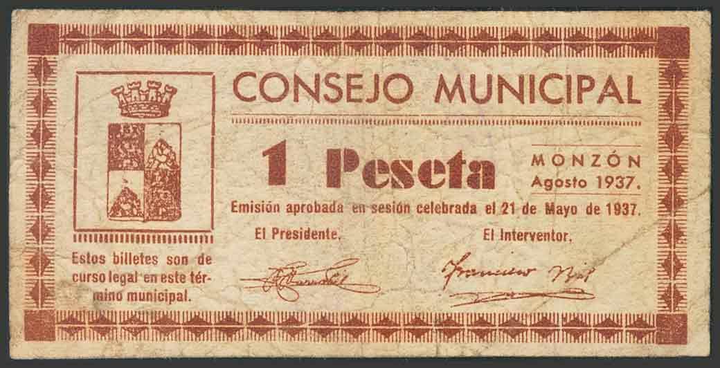 MONZON (HUESCA). 1 Peseta. Agosto de 1937. (González: 3679). BC.