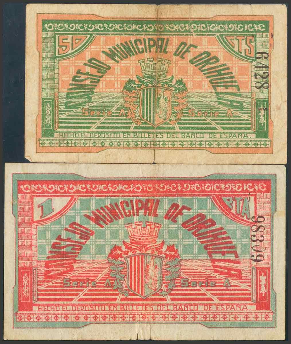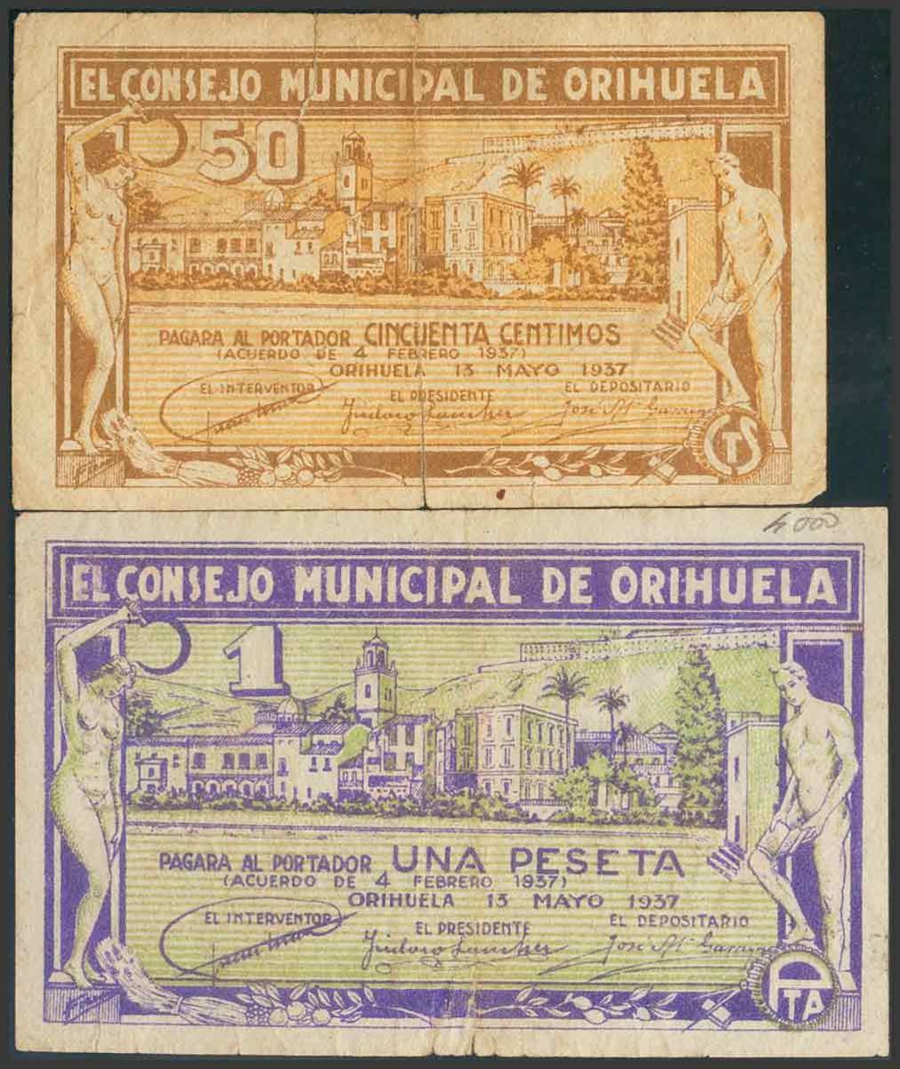 ORIHUELA (ALICANTE). 50 Céntimos y 1 Peseta. 1 de Noviembre de 1938. (González: 3993, 3994). BC.