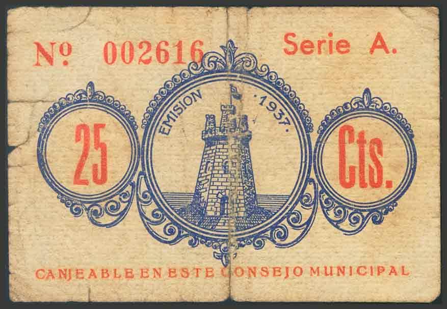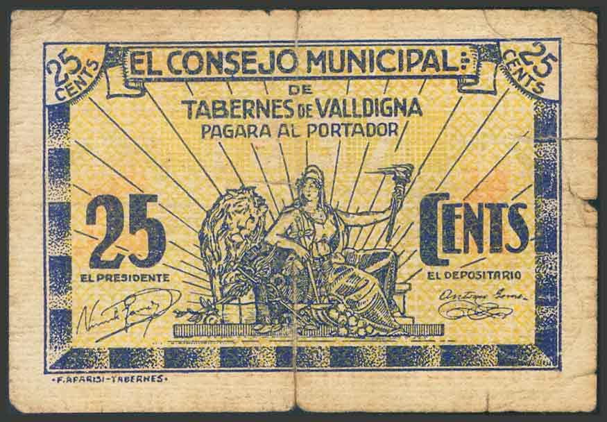 TABERNES DE VALLDIGNA (VALENCIA). 25 Céntimos. 1937. (González: 4944). Inusual. BC.