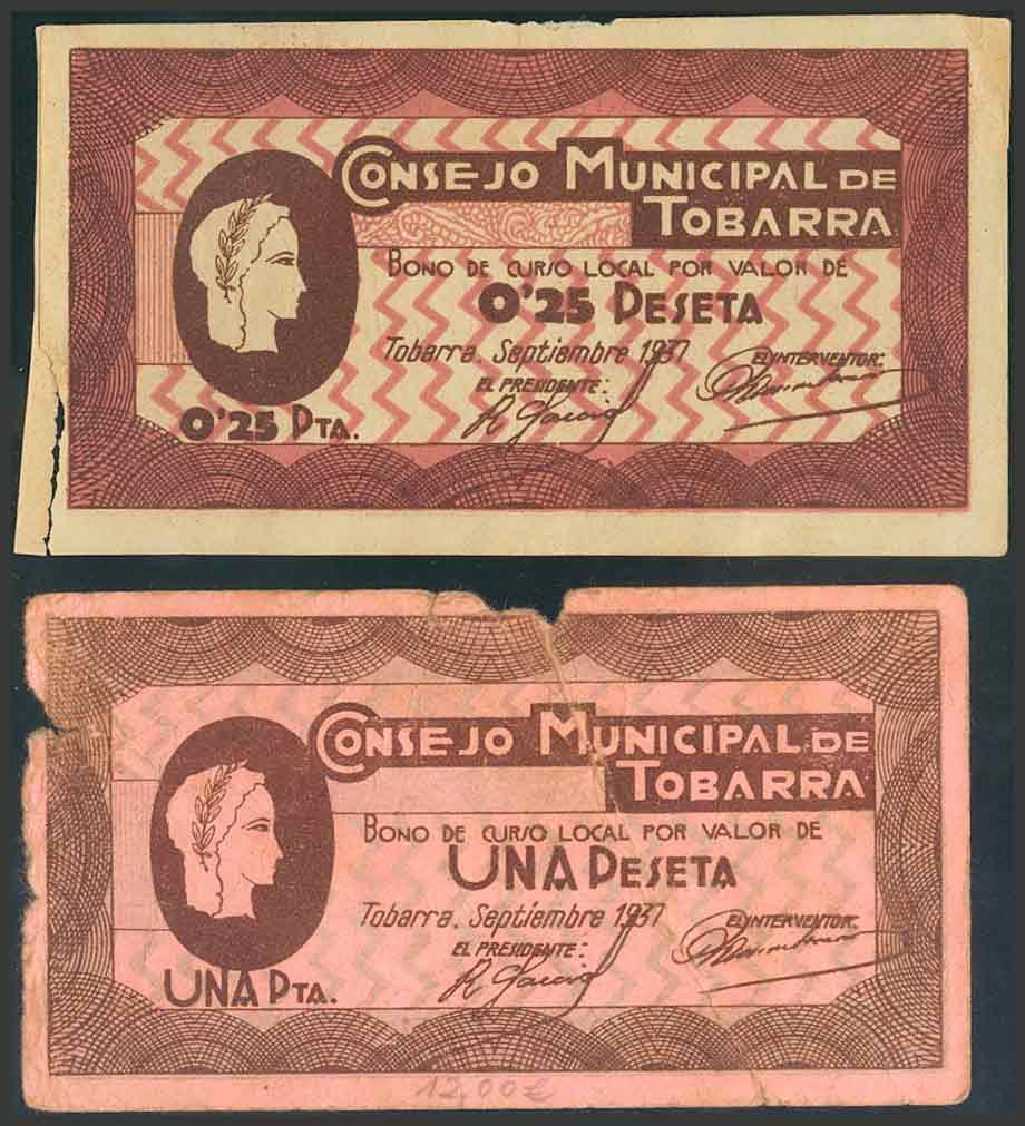 TOBARRA (ALBACETE). 25 Céntimos y 1 Peseta. Septiembre 1937. (González: 5018, 5019). BC/RC.