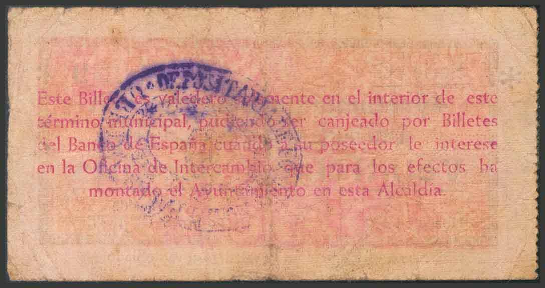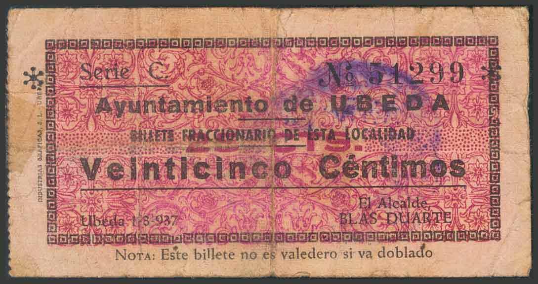 UBEDA (JAEN). 25 Céntimos. 1 de Marzo de 1937. Tipo anverso rosáceo. (González: 5195). BC-.