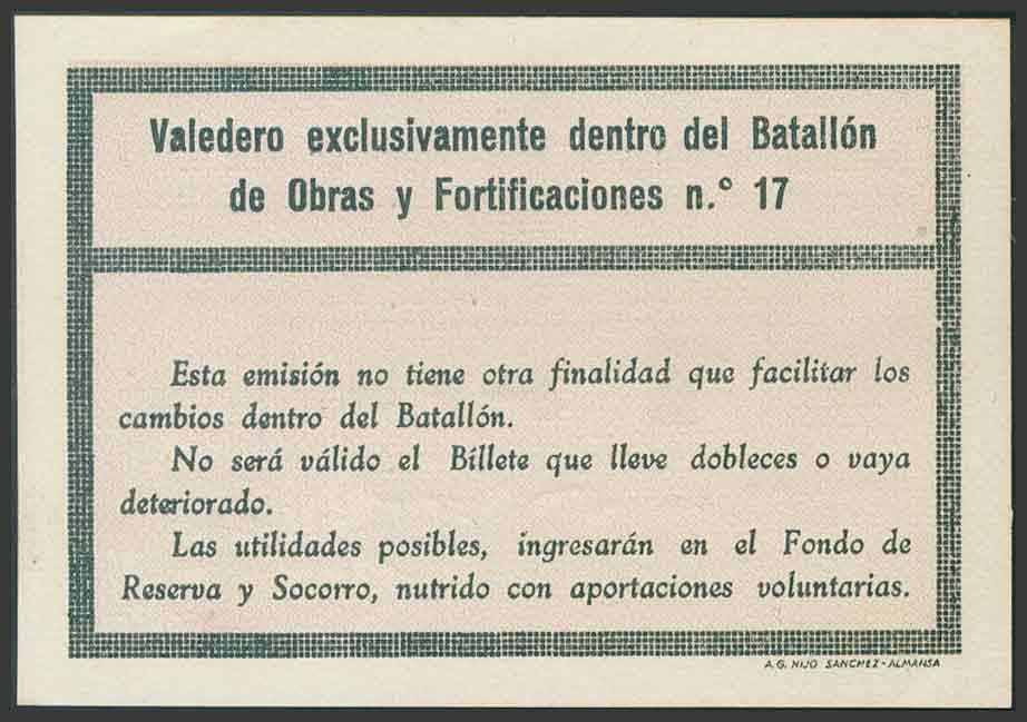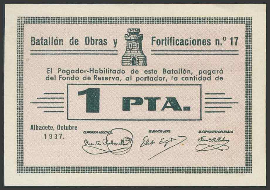 ALBACETE. 1 Peseta. Octubre de 1937. Batallón de Obras y Fortificaciones, (González: 5892). SC.