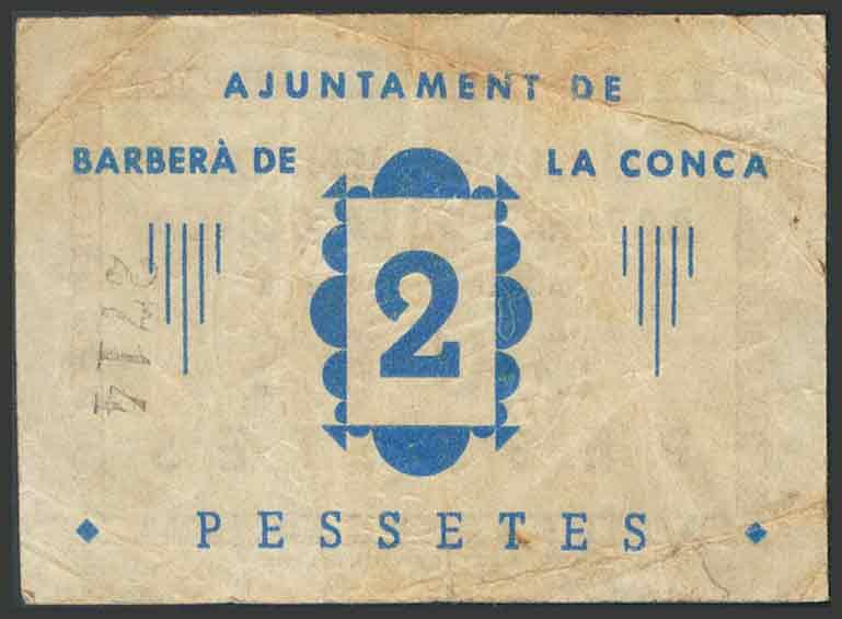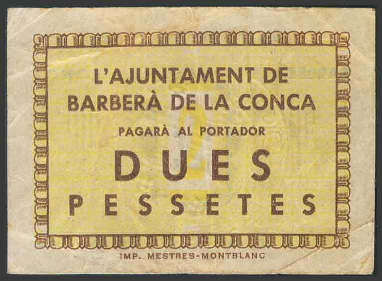BARBERA DE LA CONCA (TARRAGONA). 2 Pesetas. (1938ca). (González: 6516). BC.
