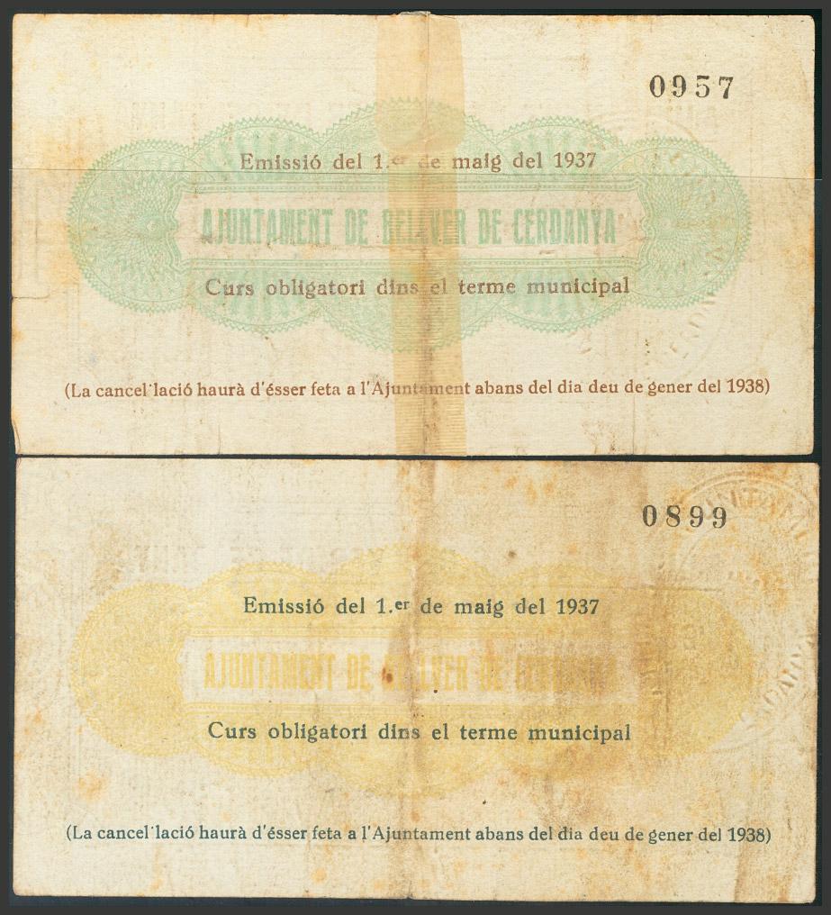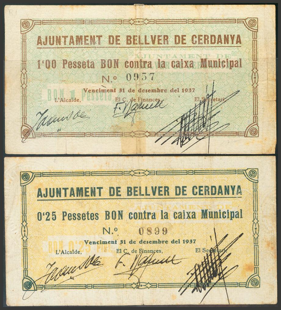 BELLVER DE CERDANYA (LERIDA). 25 Céntimos y 1 Peseta. 31 de Diciembre de 1937. (González: 7004/05). BC.