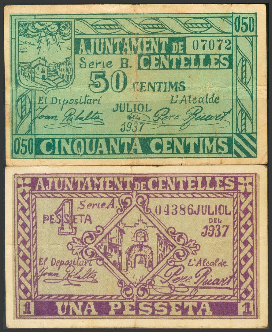 CENTELLES (BARCELONA). 50 Céntimos y 1 Peseta. Julio de 1937. Serie A. (González: 7548/49). RC.