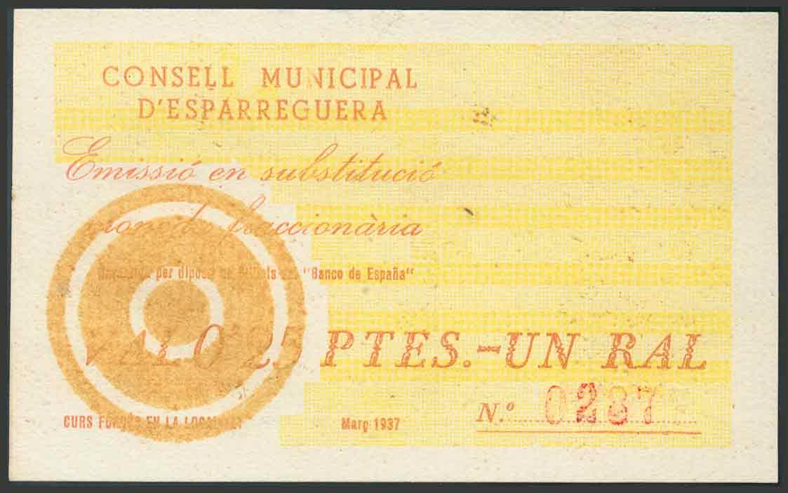 ESPARREGUERA (BARCELONA). 0´25 Pesetas. Mayo de 1937. (González: 7744, variante). EBC.