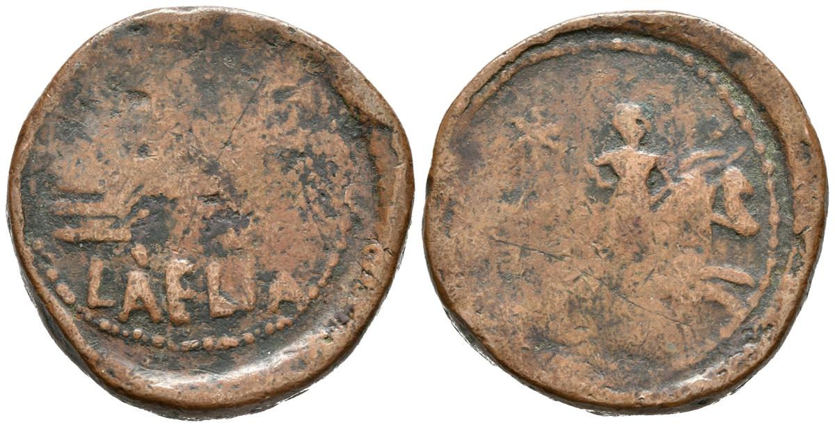 LAELIA. As. 50-20 a.C. Olivares (Sevilla). A/ Jinete con lanza a derecha, detrás estrella. R/ Palma y espiga, encima A, debajo LAELIA. FAB-1646. Ae. 32,93g. BC+. Muy escasa.