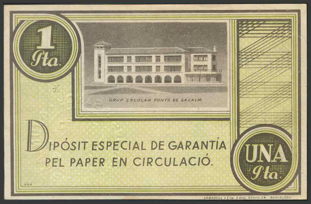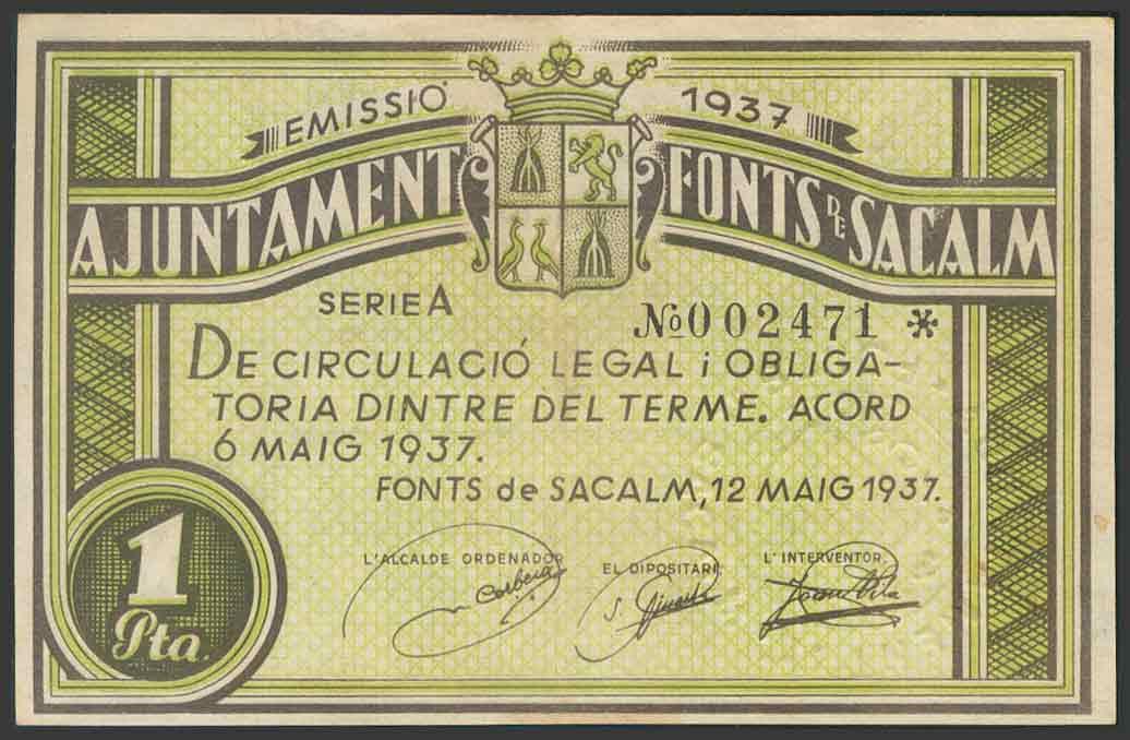 FONTS DE SACALM (GERONA). 1 Peseta. 6 de Mayo de 1937. Serie A (González: 7914). MBC.