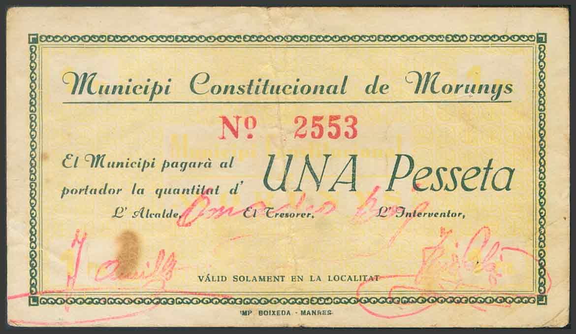 SANT LLORENÇ DE MORUNYS (LLEIDA). 1 Peseta. (1937ca) (64 mm x 112 mm, en el anverso sin estampación). (González: 8423). RC.