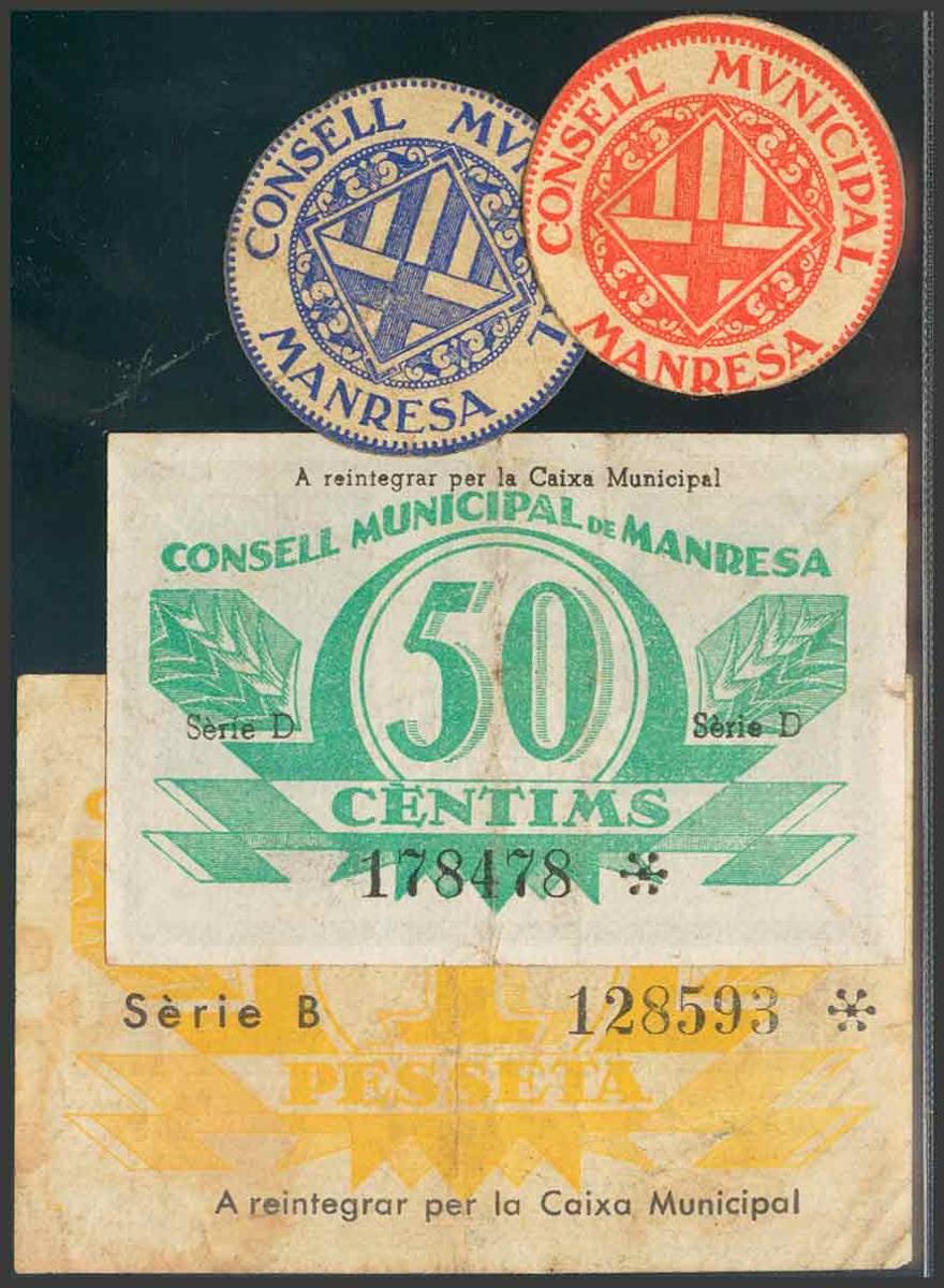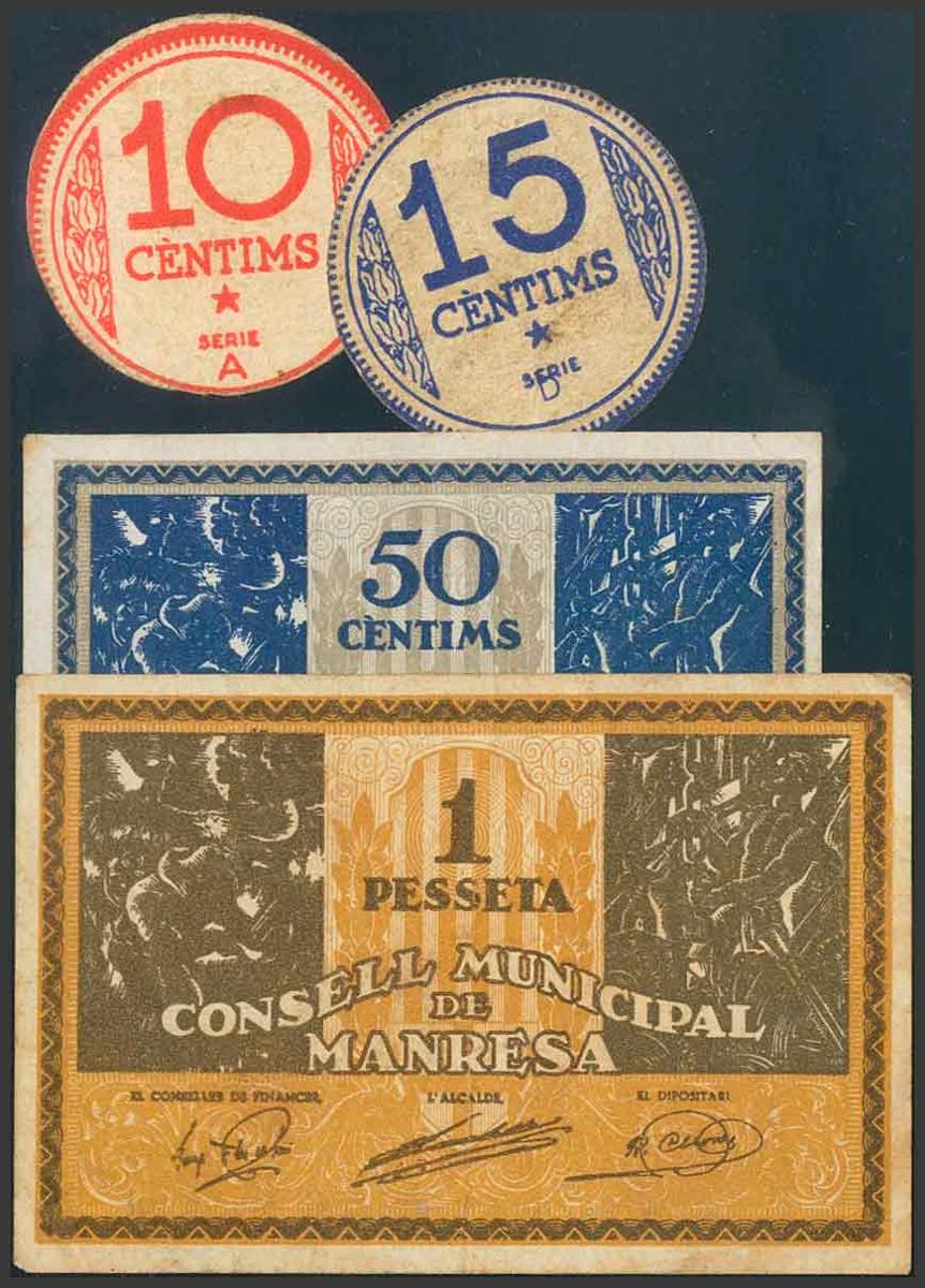MANRESA (BARCELONA). 10 Céntimos, 15 Céntimos (estos dos valores emitidos en papel y con forma de moneda), 50 Céntimos y 1 Peseta. Series A, B, D(2). (González: 8494/97). MBC/EBC.