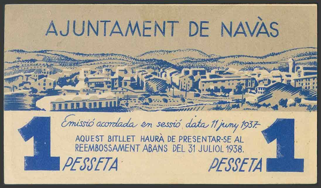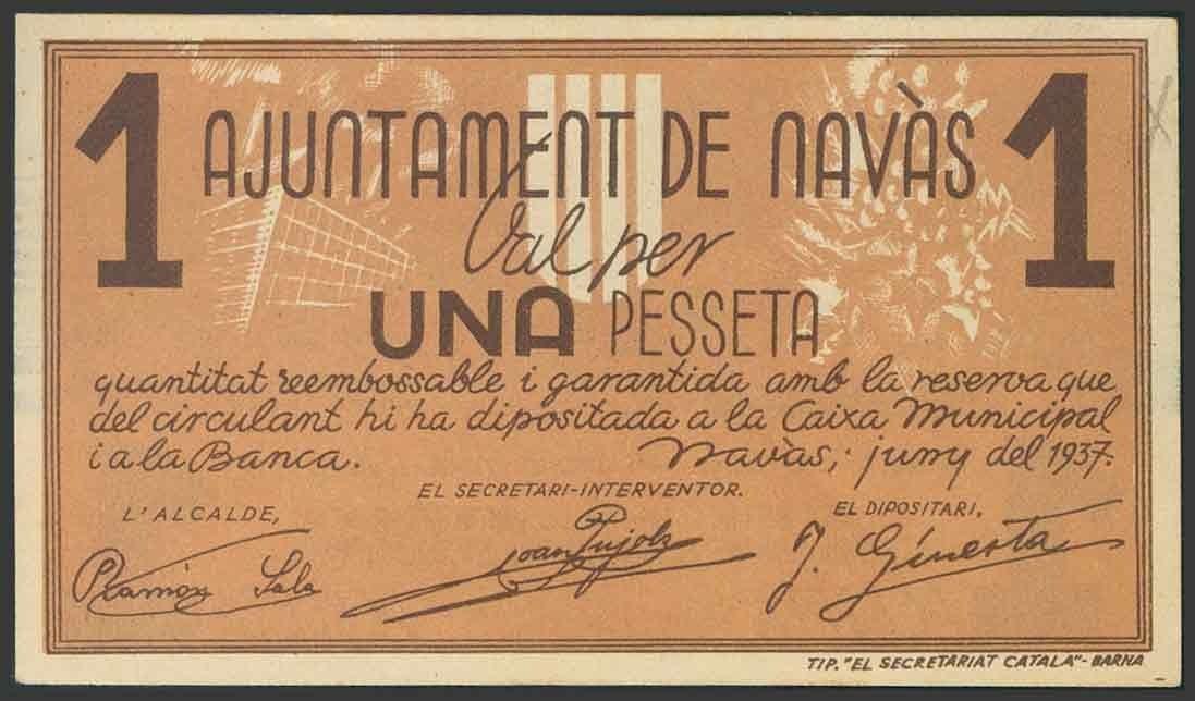 NAVAS (BARCELONA). 1 Peseta. 11 de Junio de 1937. (González: 8889). SC.