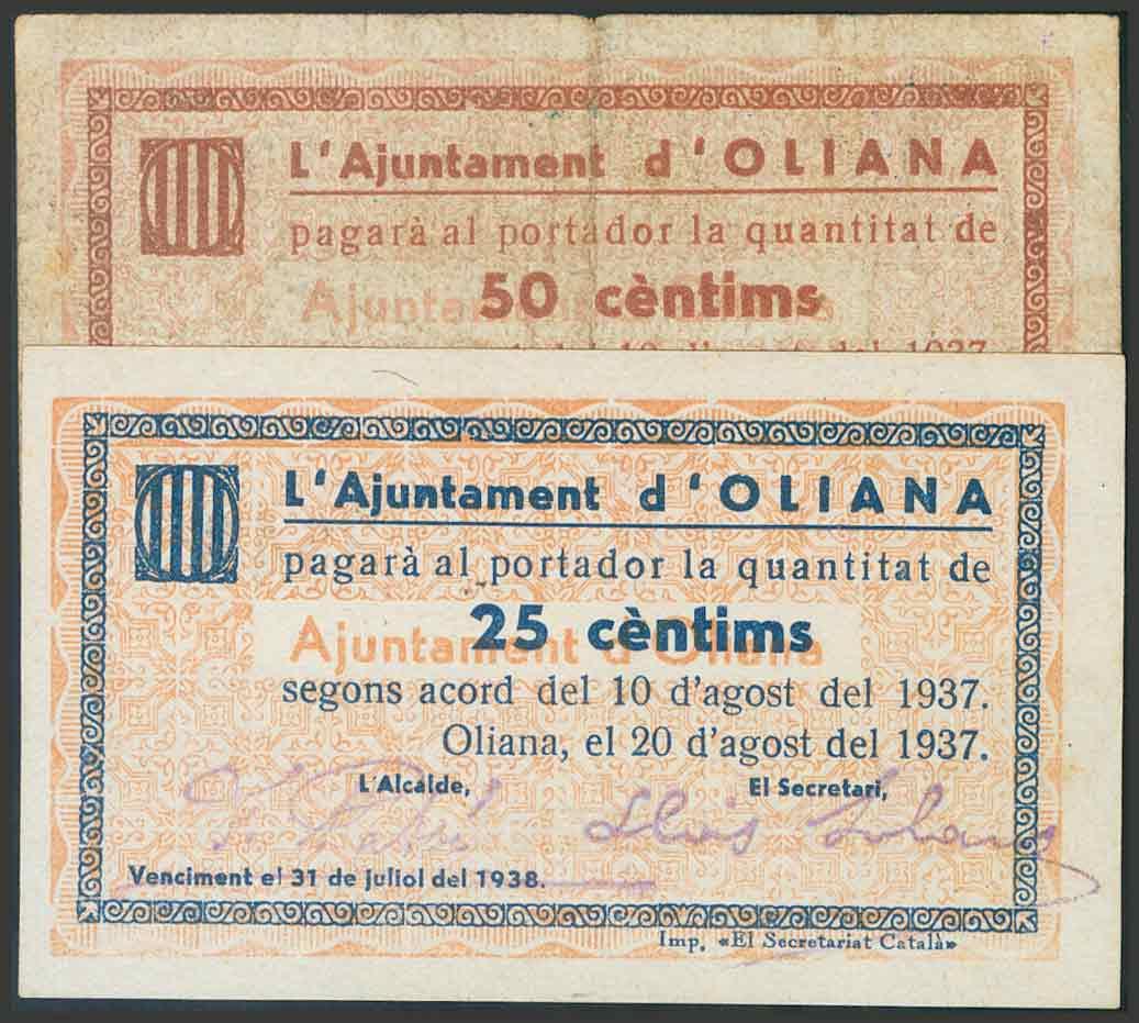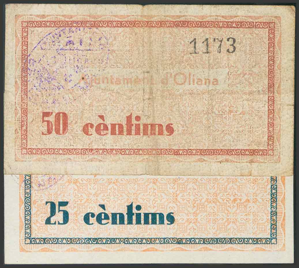 OLIANA (BARCELONA). 25 Céntimos y 50 Céntimos. 20 de Agosto de 1937. (González: 8942/43). SC/MBC.