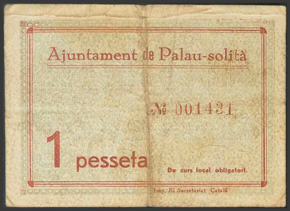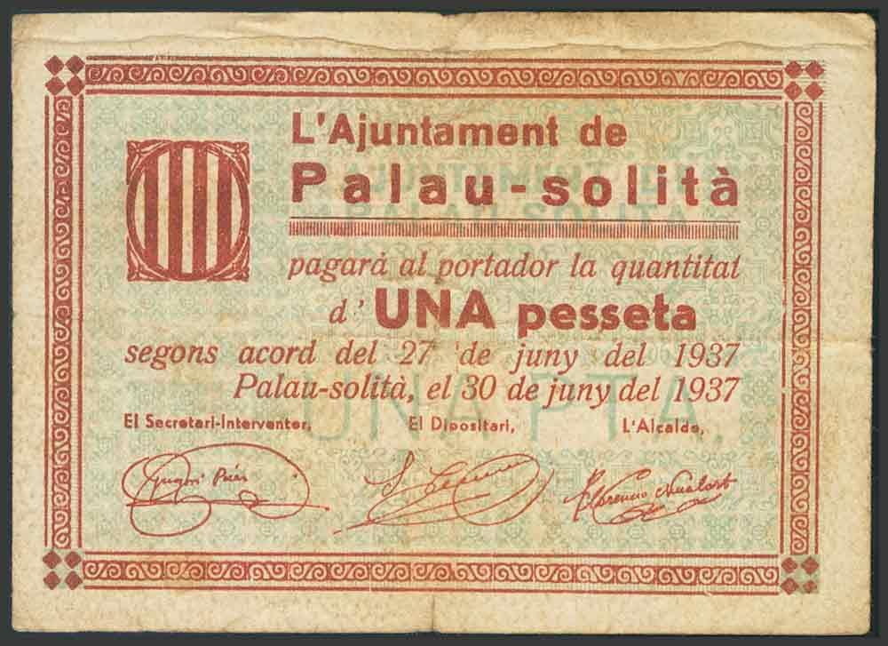 PALAU-SOLITA (BARCELONA). 1 Peseta. 30 de Junio de 1937. (González: 9130). RC.