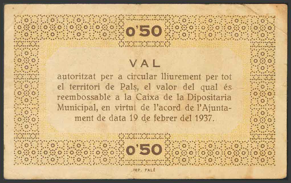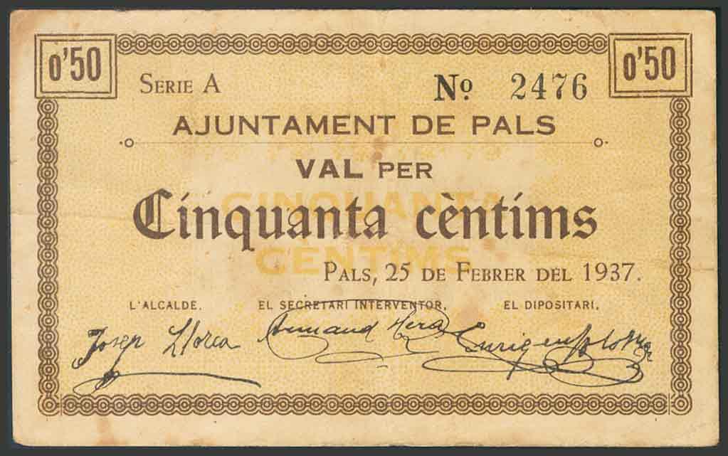 PALS (GERONA). 50 Céntimos. 25 de Febrero de 1937. Serie A. (González: 9146). BC.