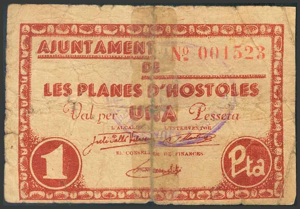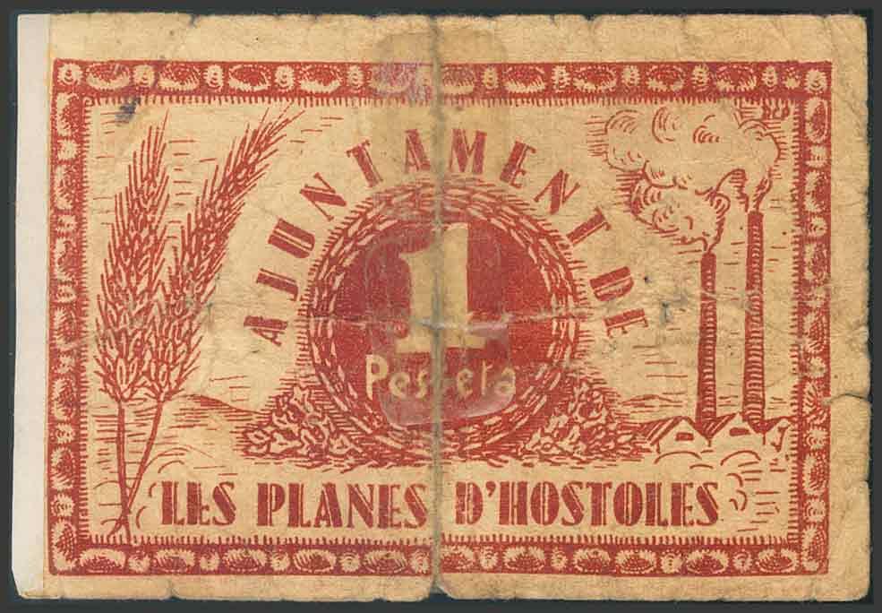 PLANES DE HOSTOLES (GERONA). 1 Peseta. (1937ca). (González: 9277). Reparado con cinta adhesiva. RC.