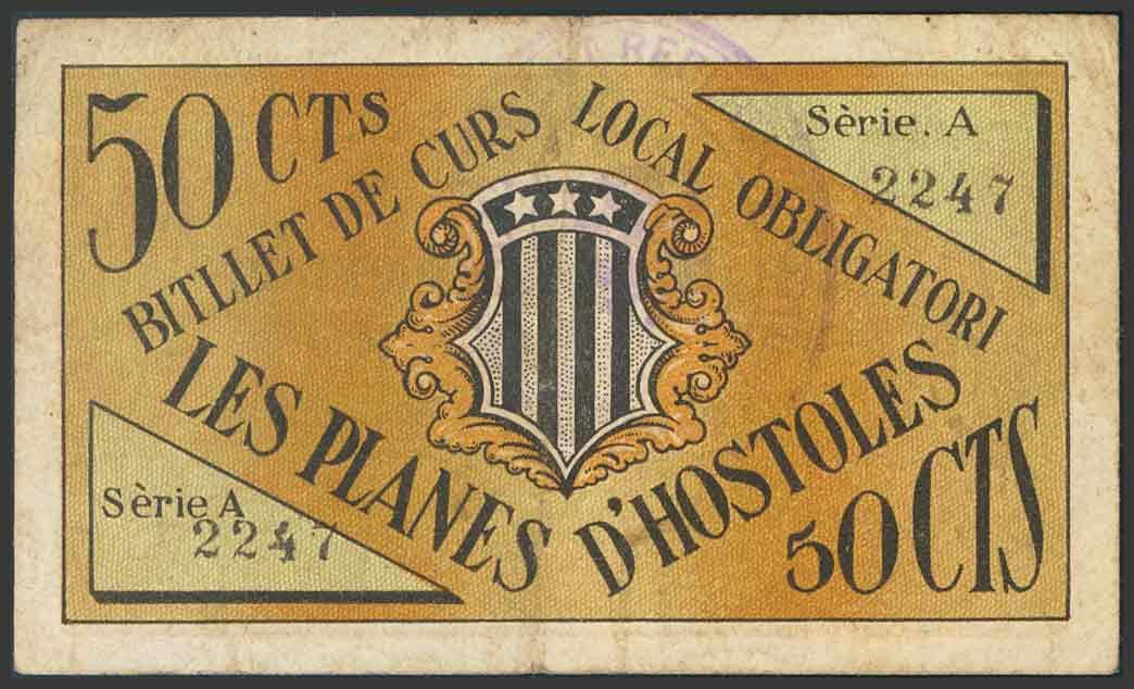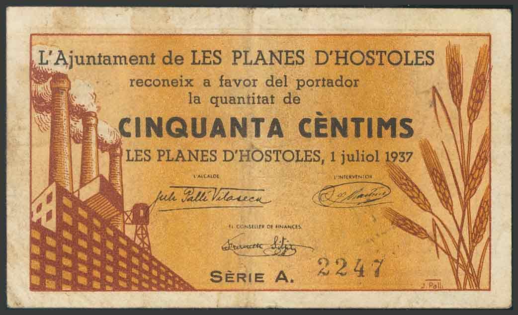 PLANES D´HOSTELES (GIRONA). 50 Céntimos. 1 de Julio de 1937. Serie A. (González: 9279). RC.