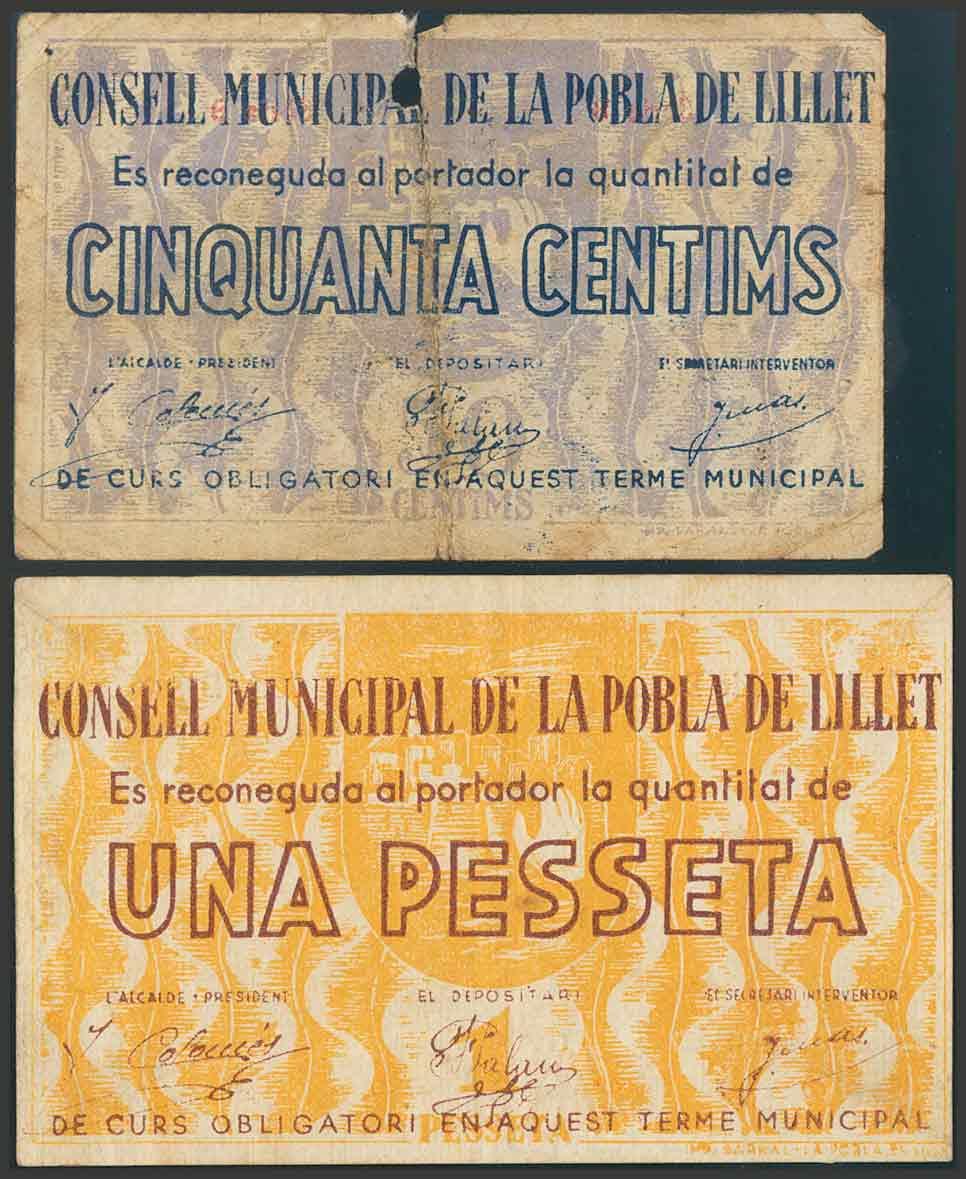 POBLA DE LILLET (BARCELONA). 50 Céntimos y 1 Peseta. (1940ca). Ambos billetes con la serie B. (González: 9319/21). RC.