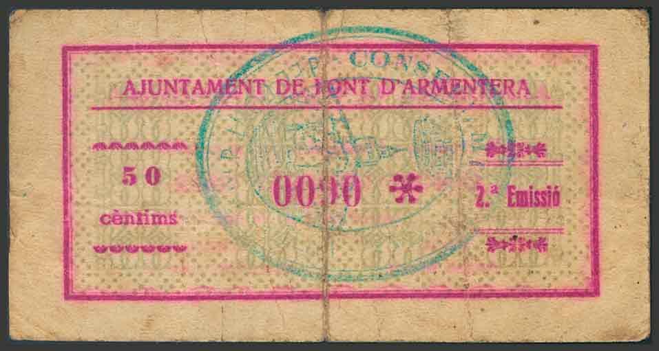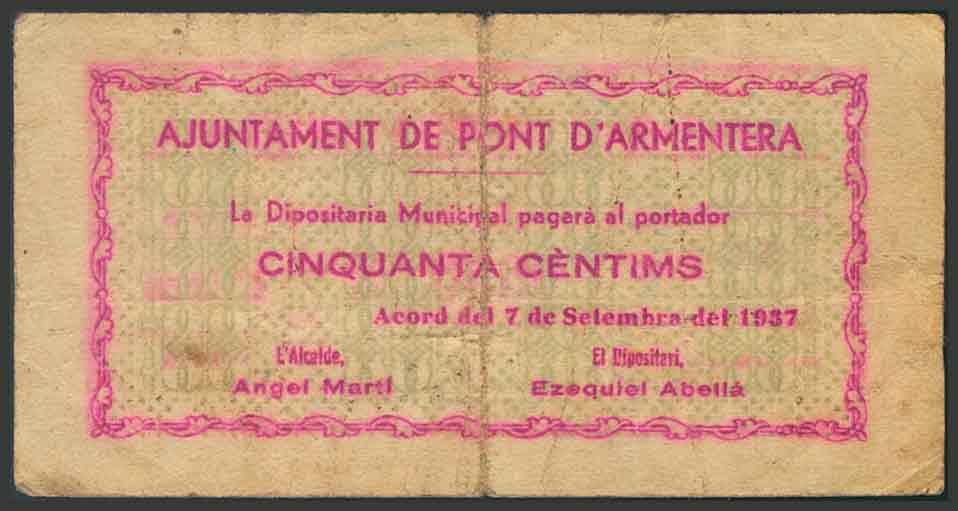 PONT D´ARMENTERA (TARRAGONA). 50 céntimos. 7 de Septiembre de 1937. (González: 9366). RC.