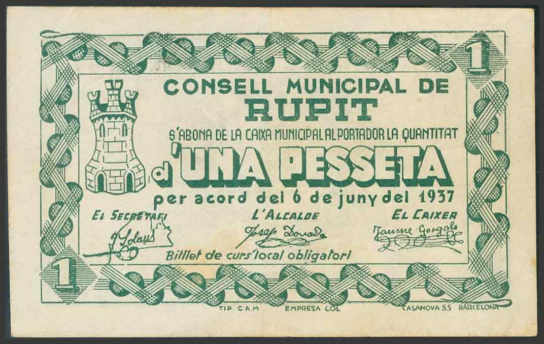 RUPIT (BARCELONA). 1 Peseta. 6 de Junio de 1937. (González: 9775). MBC.