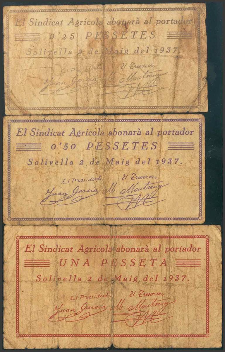 SOLIVELLA (TARRAGONA). 0´25 Pesetas, 0´50 Pesetas y 1 Peseta. 2 de Mayo de 1937. (González 10025/27). Inusual. RC.