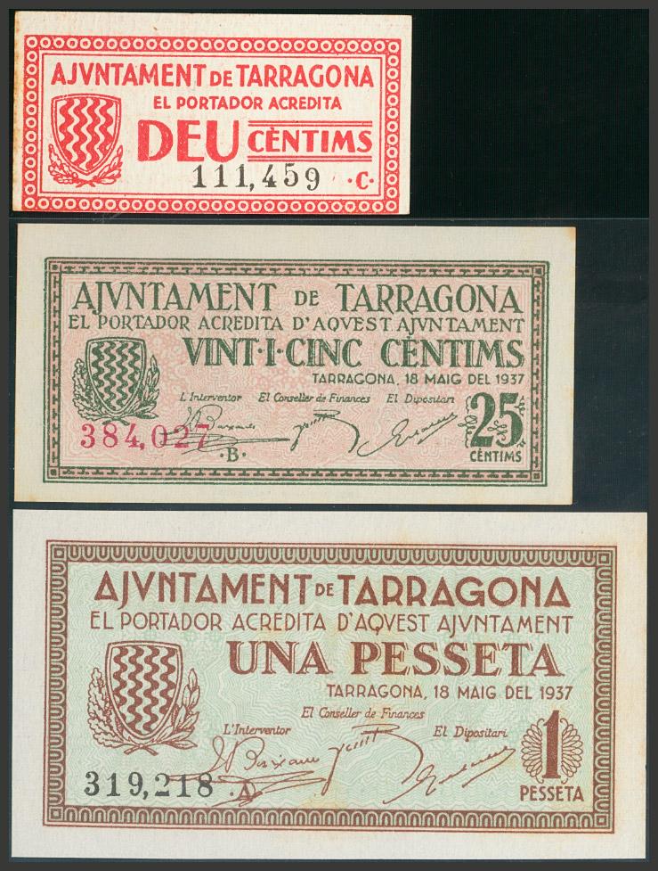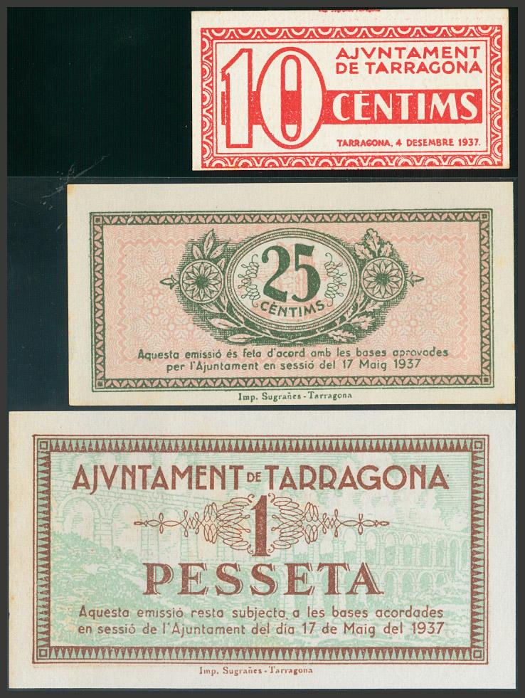 TARRAGONA. 10 Céntimos (emitido el 4 de Diciembre de 1937), 25 Céntimos y 1 Peseta, emitidos el 17 de Mayo de 1937. (González: 10085/86, 10088). EBC.