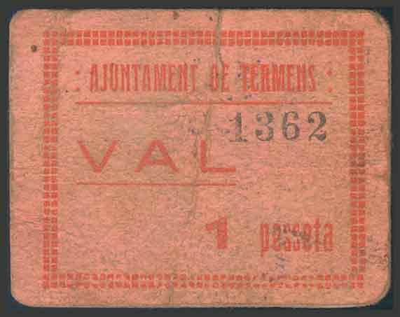 TERMENS (LLEIDA). 1 Peseta. (1938ca). (González: 10131). BC.