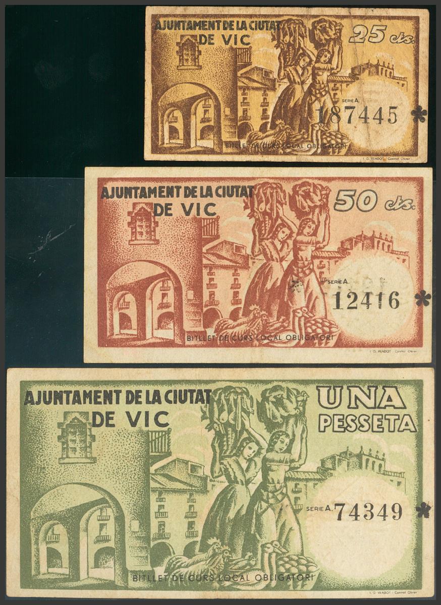 VIC (BARCELONA). 25 Céntimos, 50 Céntimos y 1 Peseta. 7 de Junio de 1937. Serie A. (González: 10629/31). BC.
