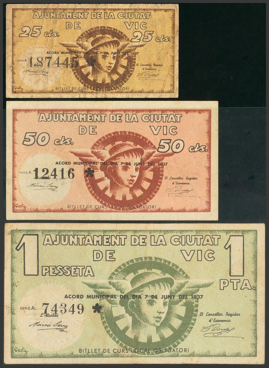 VIC (BARCELONA). 25 Céntimos, 50 Céntimos y 1 Peseta. 7 de Junio de 1937. Serie A. (González: 10629/31). BC.