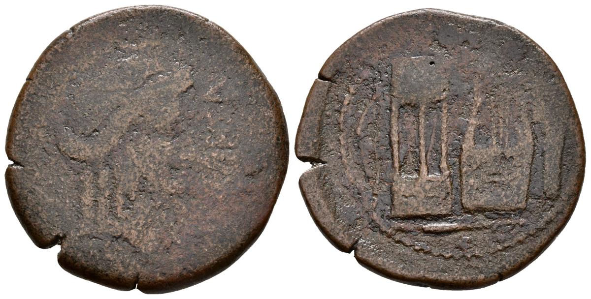 SALPESA. As. 50 a.C. Utrera (Sevilla). A/ Cabeza de Apolo a derecha, delante SALPESA. R/ Trípode y lira entre arco y aljaba. FAB-2109. Ae. 10,42g. Acuñación débil habitual en estas piezas. BC-/BC. Muy rara.