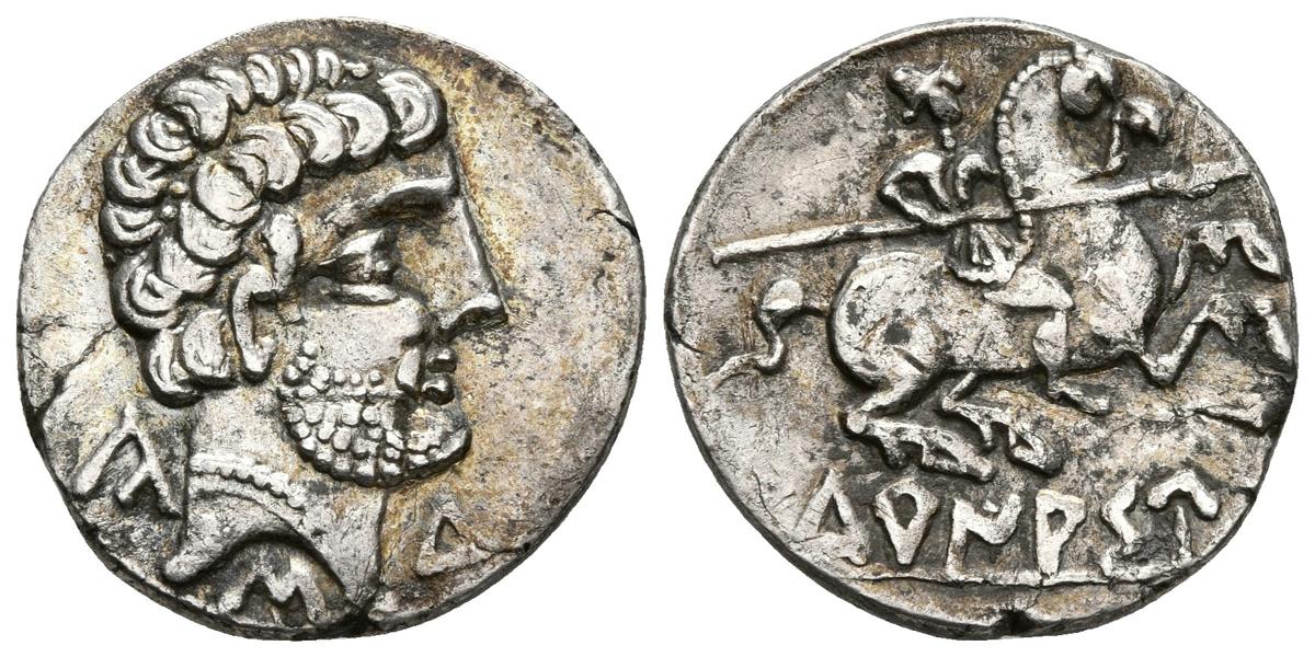 TURIASO. Denario. 120-80 a.C. Tarazona (Zaragoza). A/ Cabeza masculina a derecha con doble collar y letras ibéricas Ca.S.Tu. R/ Jinete con lanza a derecha, debajo TuRIASU. FAB-2417. Ar. 3,89g. MBC+.