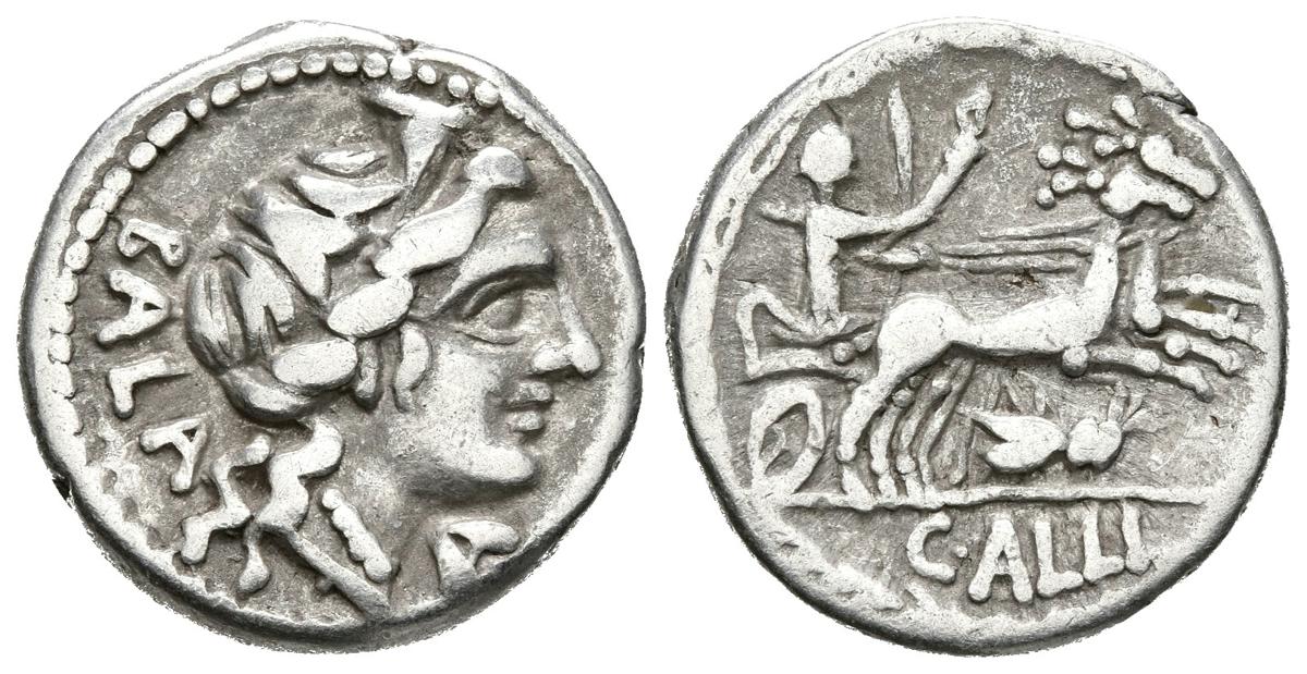 C. ALLIUS BALA. Denario. 92 a.C. Roma. A/ Busto femenino a derecha, detrás BALA, delante letra de control A. R/ Diana guiando biga de ciervos a la derecha, sobre su hombro porta carcaj, sostiene un cetro y antorcha junto a las riendas, bajo la biga símbolo de saltamontes. En exergo C·ALLI. Craw 336.1b; RSC Allia 4. Ar. 3,83g. MBC+/MBC.