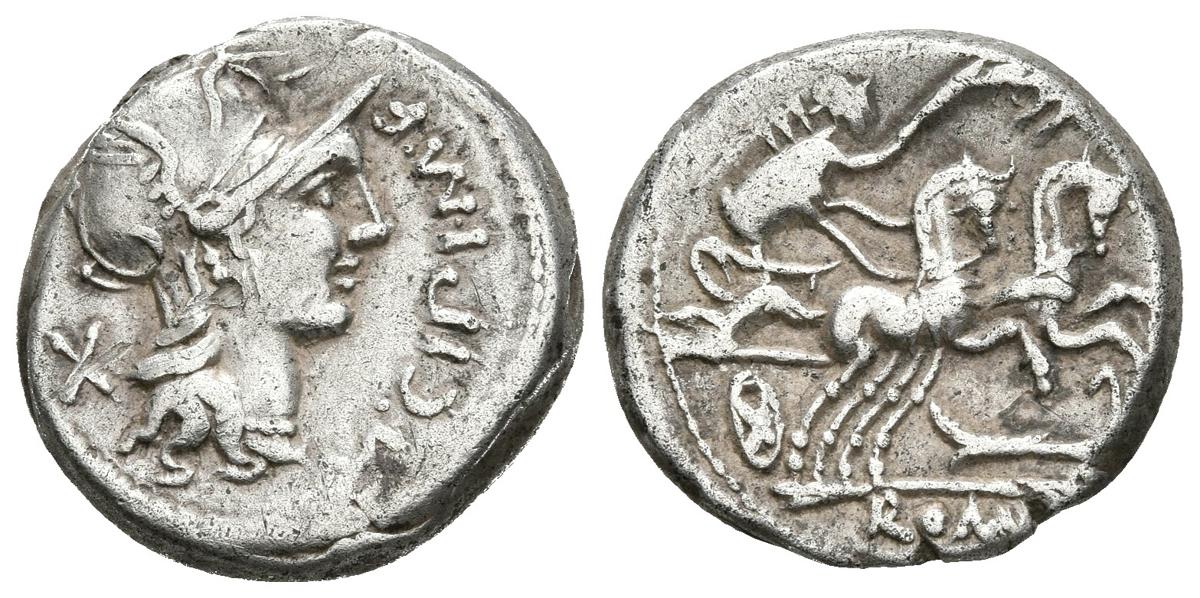 M. CIPIUS. Denario. 115-114 a.C. Roma. A/ Cabeza de Roma a derecha, delante M CIPI M F, detrás X. R/ Victoria guiando biga a derecha, portando palma, debajo timón, en exergo ROMA. Craw 289.1. Ar. 3,85g. Raya en anverso. MBC+/MBC.