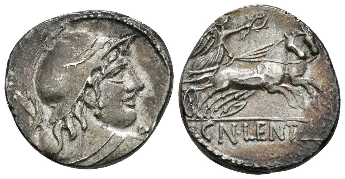 CN. LENTULUS CLODIANUS. Denario. 88 a.C. Roma. A/ Busto de Marte con casco a derecha visto desde atrás. R/ Victoria en biga a derecha, llevando las riendas y portando corona, en exergo CN·LENTVL. Craw 345.1; RSC Cornelia 50. Ar. 3,86g. Bonito tono. EBC-.
